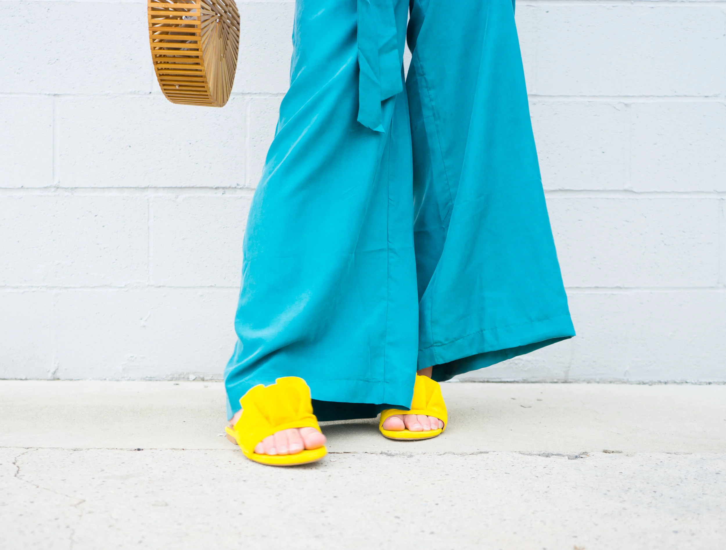 Red. Teal. Yellow. Would you think to pair all three of these colors together? No right? Me neither! That is until I started thinking like a maximalist. I put on my teal Silk Wide Leg Pants, by Le Mouton Bleu Shop (which are incredibly comfortable and are now my favorite pants ever) and thought to myself, "what other colorful pieces would make this outfit pop?" And so I went to my shoe collection and forced myself to go outside my comfort zone of white or black shoes, and instead picked out my most color flats! And that's how I came to pair these elegant pants with the bright yellow Matrix Frill Detail Slider, by EGO. But two bright colors wasn't enough of a "mash-up" for me so I added a red handkerchief to the mix.